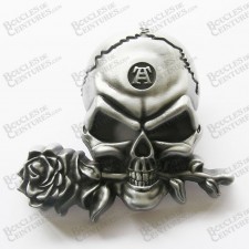 BOUCLE DE CEINTURE TÊTE DE MORT AVEC UNE ROSE COULEUR ARGENT DANS LA BOUCHE BOUCLE EN MÉTAL AVEC ÉMERILLON CLASSIQUE AU DOS DE LA BOUCLE.BOUCLE NUE A MONTER SUR UNE CEINTURE DE LARGEUR STANDARD DU TYPE JEANS.ADAPTABLE SUR TOUT MODÈLE DE CEINTURE DE 4>5 CM DE LARGE