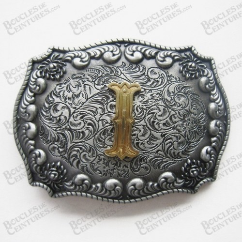 BOUCLE DE CEINTURE AVEC INITIALE LETTRE "I" COULEUR BRONZE SUR FOND ARGENT